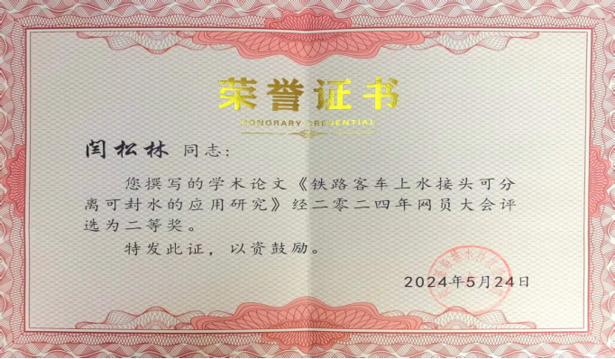 在2024年鐵路給排水科技情報網(wǎng)年會中,我公司總經(jīng)理閆松林撰寫的學(xué)術(shù)論文《鐵路客車上水接頭可分離可封水的應(yīng)用研究》經(jīng)2024年網(wǎng)員大會評選,榮獲2024年度鐵路給排水科技情報網(wǎng)優(yōu)秀論文二等獎。